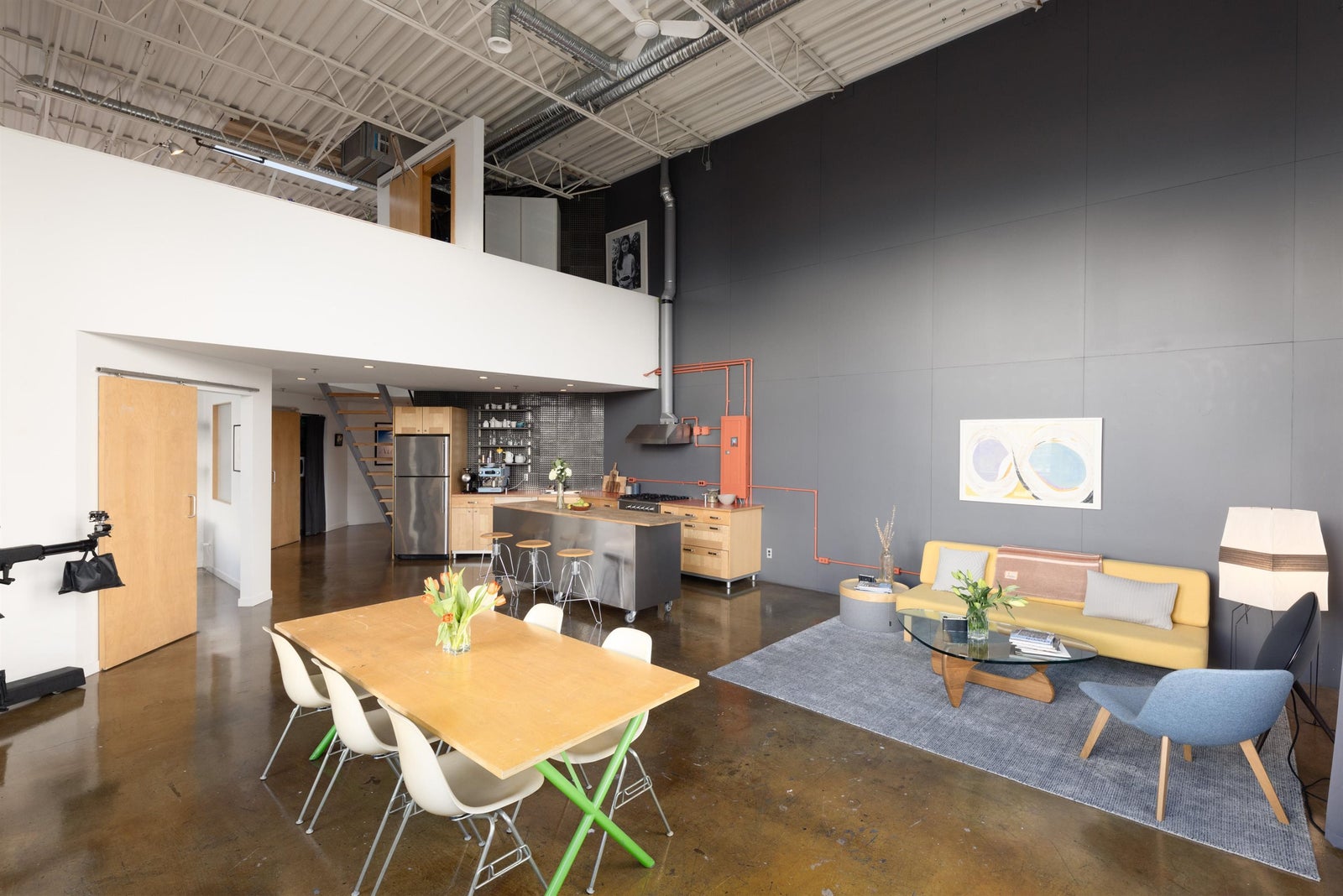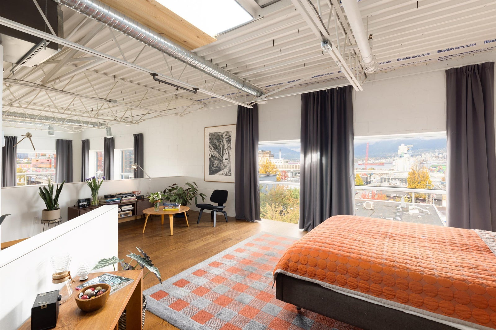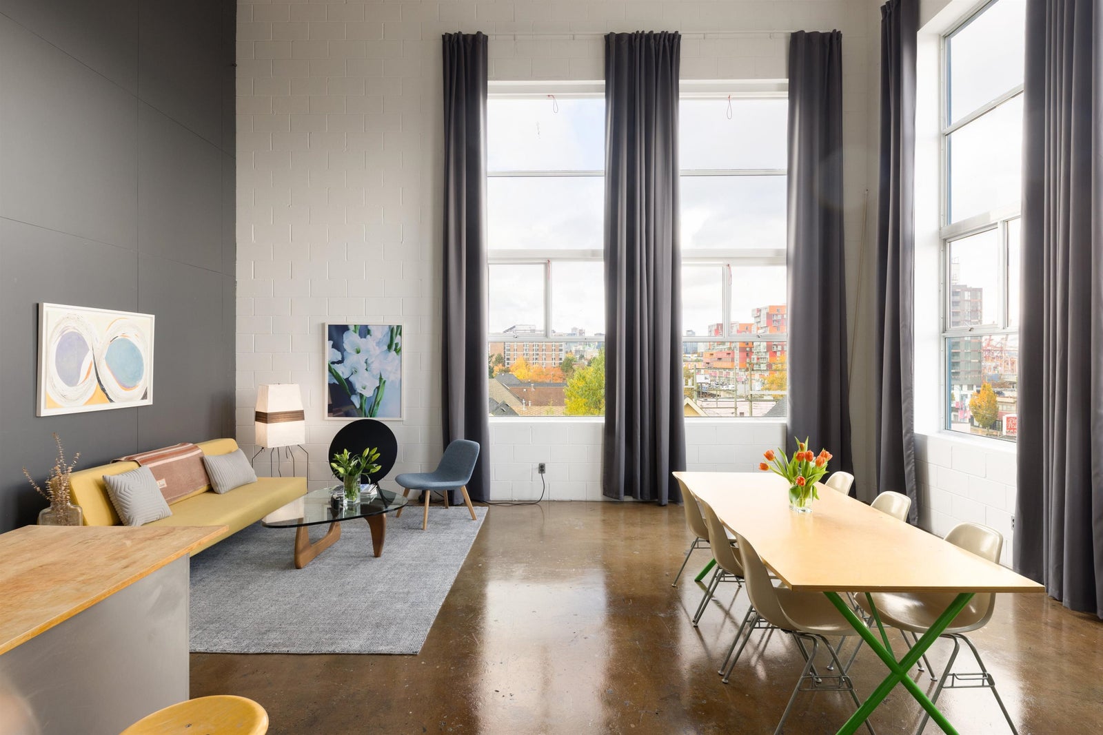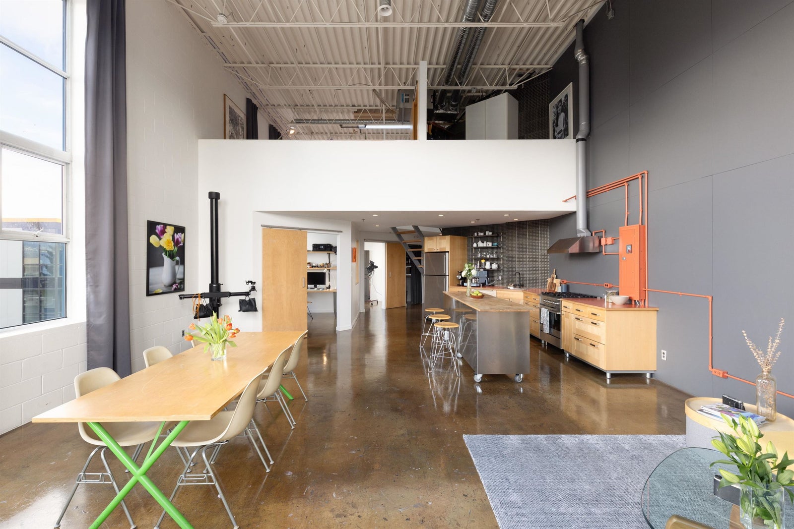 Coveted NW PENTHOUSE, 2-level WORK-LIVE loft at the "Workshop", a concrete building with a decidedly New York feel on the edge of vibrant Strathcona. Soaring 18'4" ceilings with full height windows on the West and North sides offer stunning downtown & mountain views over a quiet tree-lined street. The perfect combination of open space and industrial style in this spacious 1800sf live-work loft. The kitchen is outfitted with gas range and large movable island. A/C (newer heat pump) & dual heating system keep this space comfortable year round. In-suite laundry, 2 secure parking and tons of in-suite storage. The Workshop is a well-cared-for, built-to-last, rainscreened building with new roof & durable metal exterior. Call for your private showing.