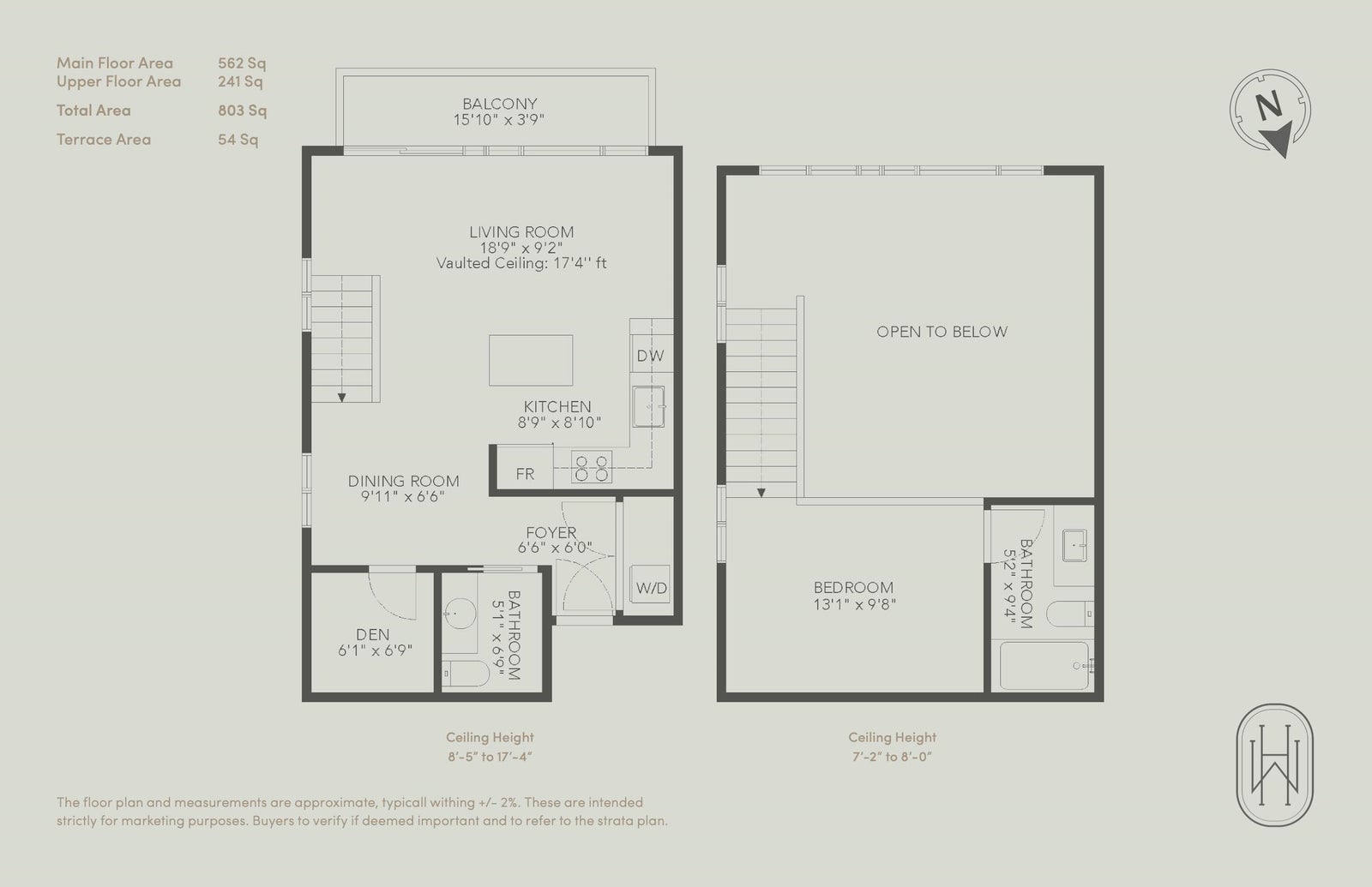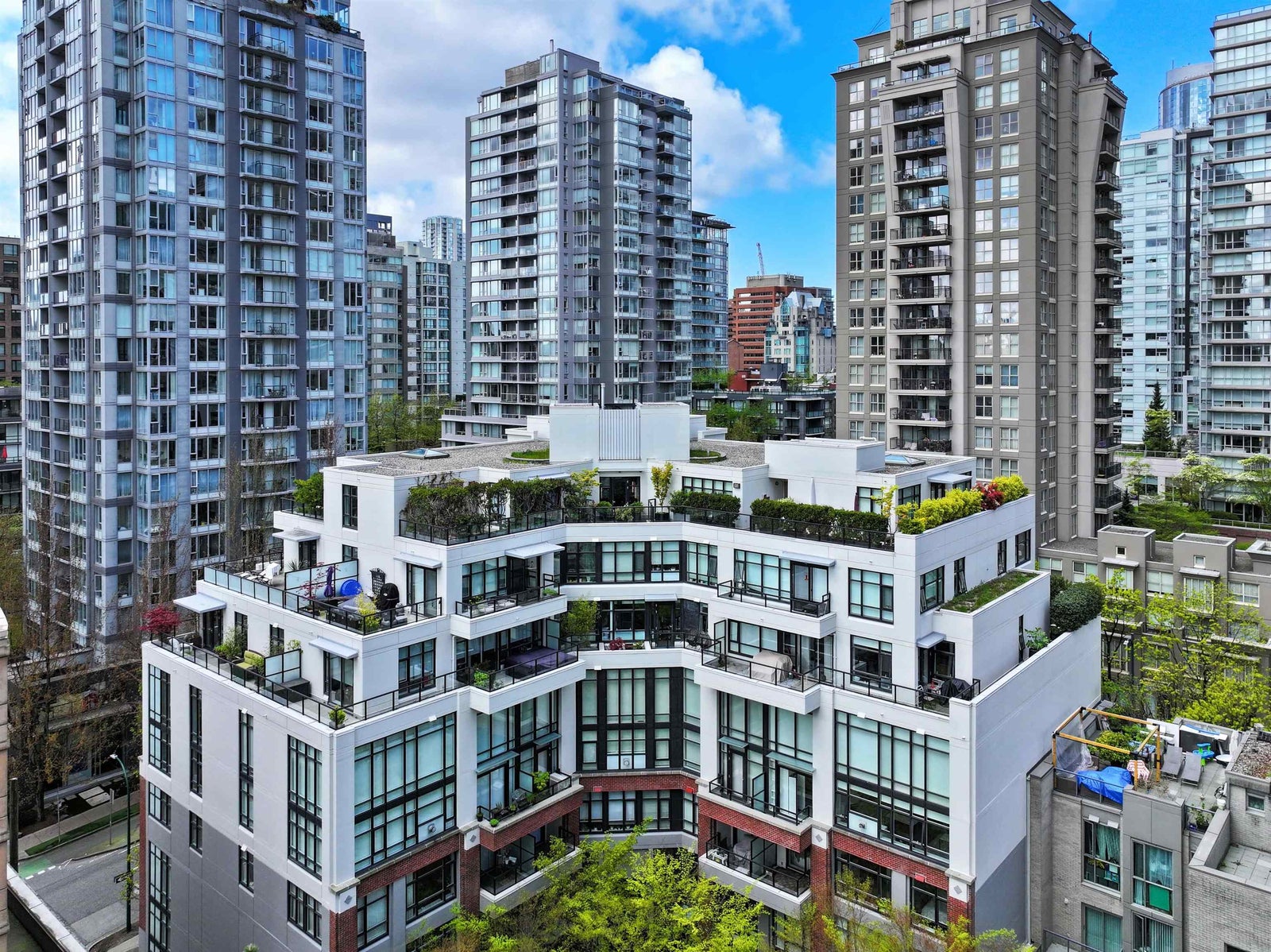Welcome to ‘Tribeca Lofts’ rare corner 2-level Yaletown loft w/ tons of natural light. Truly one-of-a-kind! A functional 803 sq layout, this home features double-height 17’-3” ceilings, NEW blackout automated roller blinds, exposed concrete feature wall, floating steel staircase, & custom floor-to-ceiling draperies. Enjoy the bright main floor living room & kitchen (opening onto the full-width terrace), a spacious dining area, versatile den, powder room & a large entry closet w/ laundry. Upstairs you'll find the bedroom (w/ large window!) & ensuite bathroom featuring a large vanity, timeless tile & accent lighting. ‘Tribeca Lofts’ is a boutique New York-inspired loft building w/ a recently completed full exterior envelope refresh. Steps to Yaletown restaurants, shopping & transit.